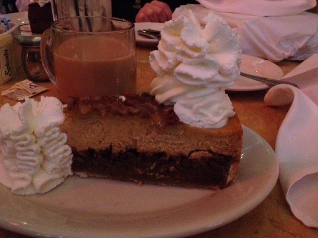 Carmine’s serve family style Italian dishes so we decided to go with the Veal parm with angel hair pasta, and it was plenty for the four of us. Let the carb-o-loading begin! Carmine’s has recently opened up in the Forum Shops in Caesar’s Palace, the same place where the Cheesecake Factory is, would be rude to walk by without getting anything! I got the pumpkin pecan cheesecake, cause I love anything pumpkin pecan, but it wasn’t as good as I hoped it would be. My cousin’s husband Andrew got the dulce de leche, which was awesome so I helped him out with that!