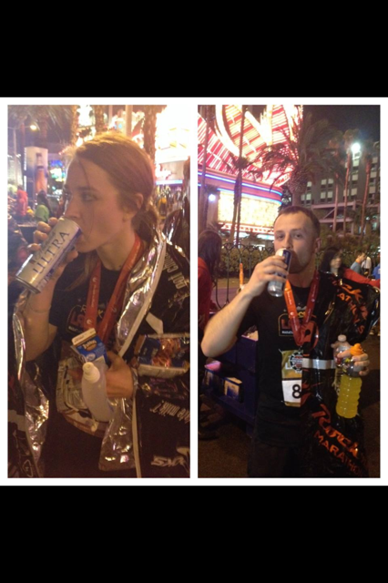We got our medals, some pretzels, and some chocolate milk throughout the walk out and at the end they were passing out beers, beer me! Only in Vegas!