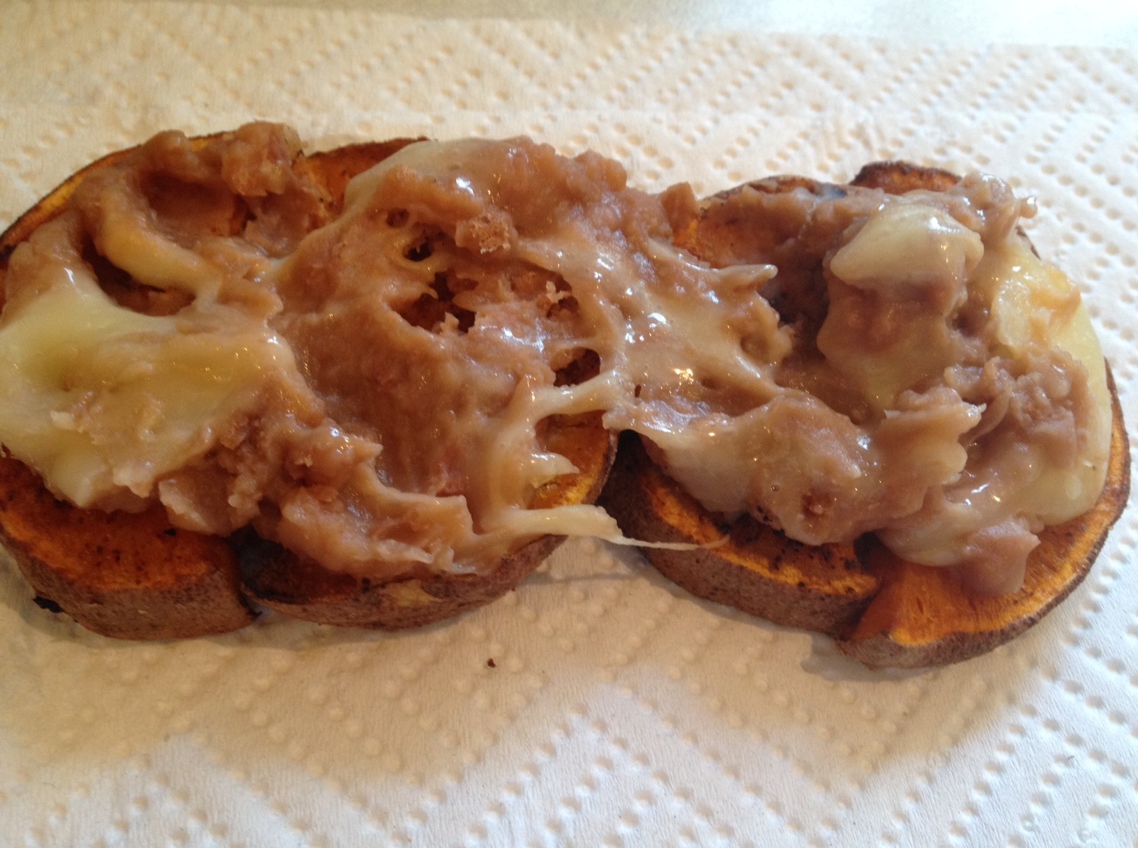 Growing up in Texas, I pretty much lived off of refried bean and cheese tacos, Taco Cabana anyone?! As much as I love tortillas, they are made with white flour and lard so I thought I would put my beloved beans and cheese on some leftover roasted sweet potatoes for some more nutritional value instead. They are the perfect after work snack and a few bites is all I need to get my fix. You can take the girl out of Texas…….