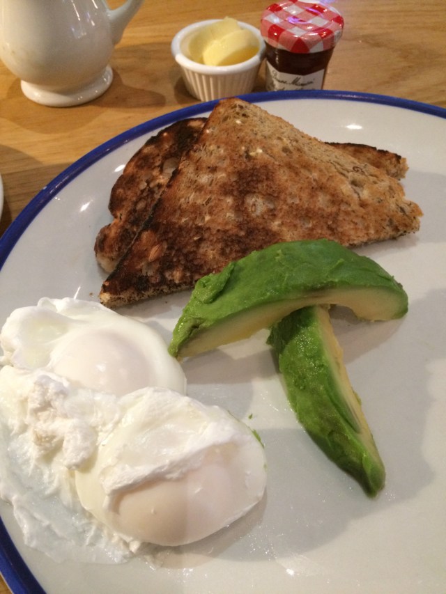 Breakfast at airport pub: Poached eggs, avocado and toast.