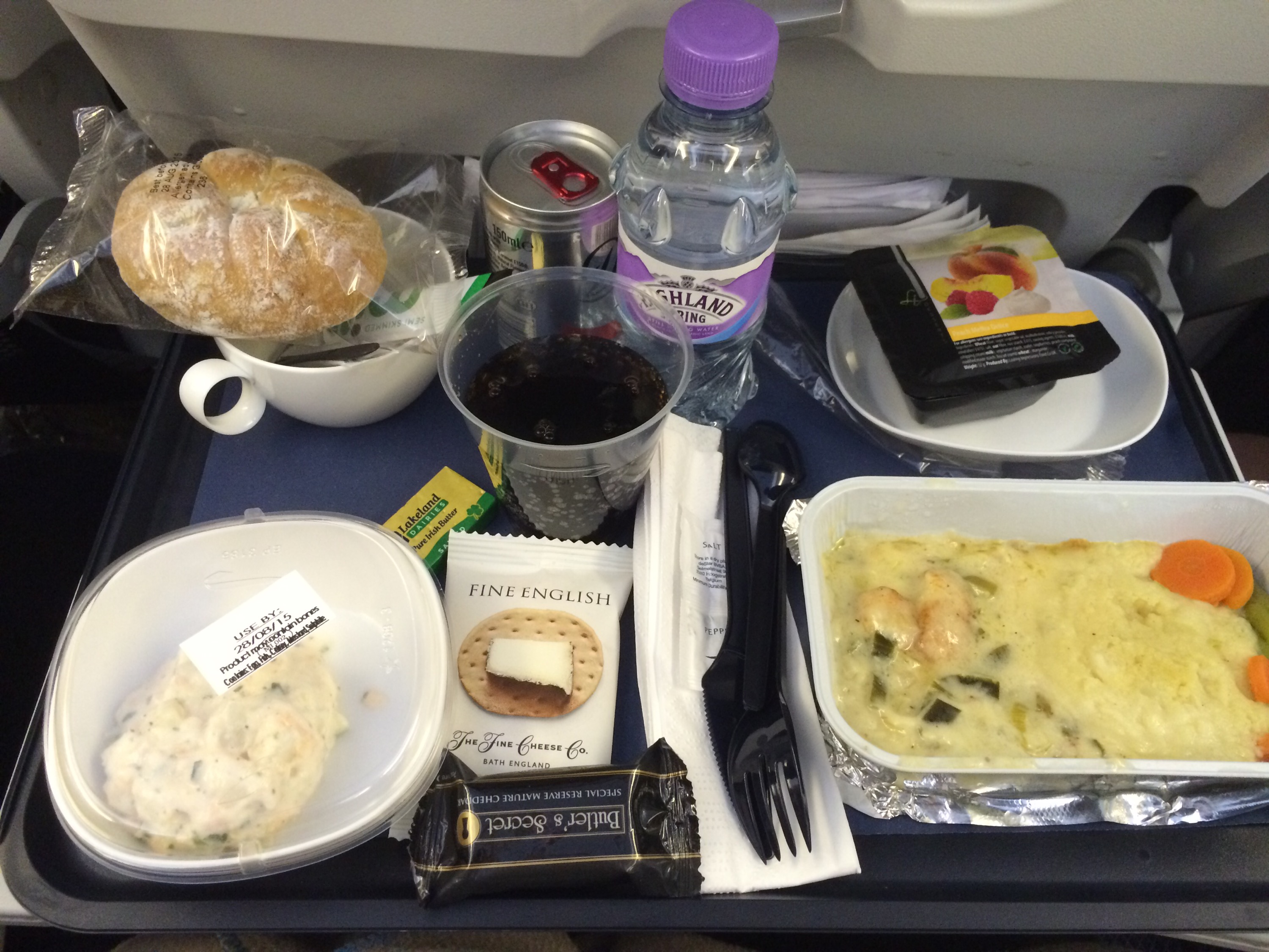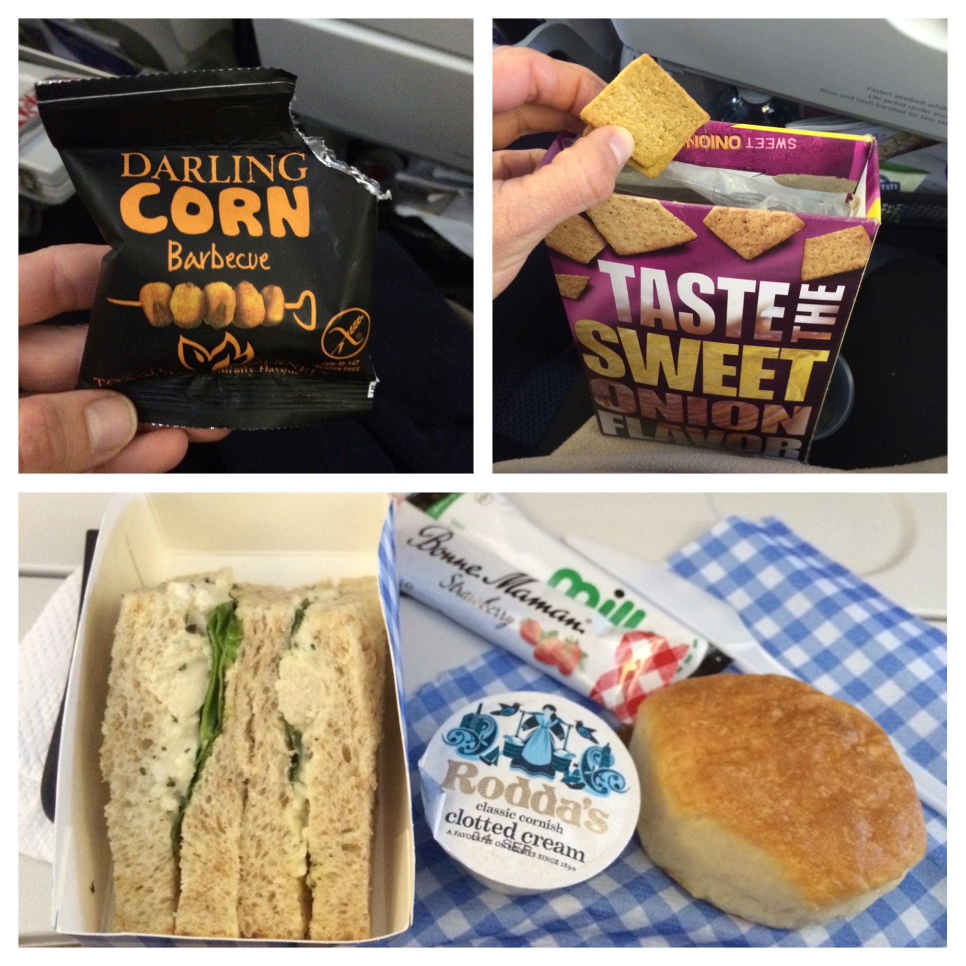 Snacks! Sweet onion wheat thins we brought, BBQ corn nuts and a chicken and pesto sandwich with a scone and clotted cream before we landed.