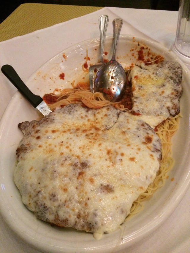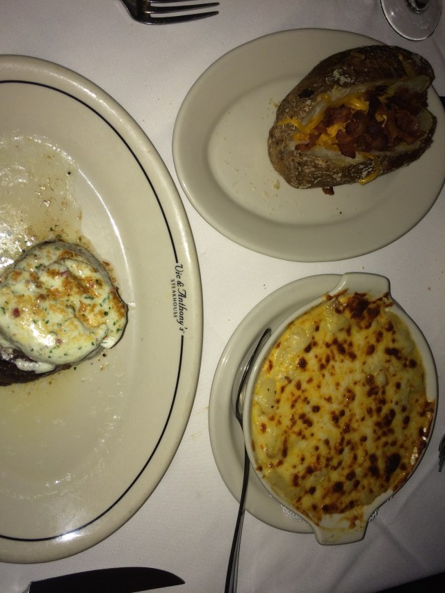 Bad picture, but steak with blue cheese butter at Vic and Anthony’s. I had the potatoes au gratin and he had the baker.